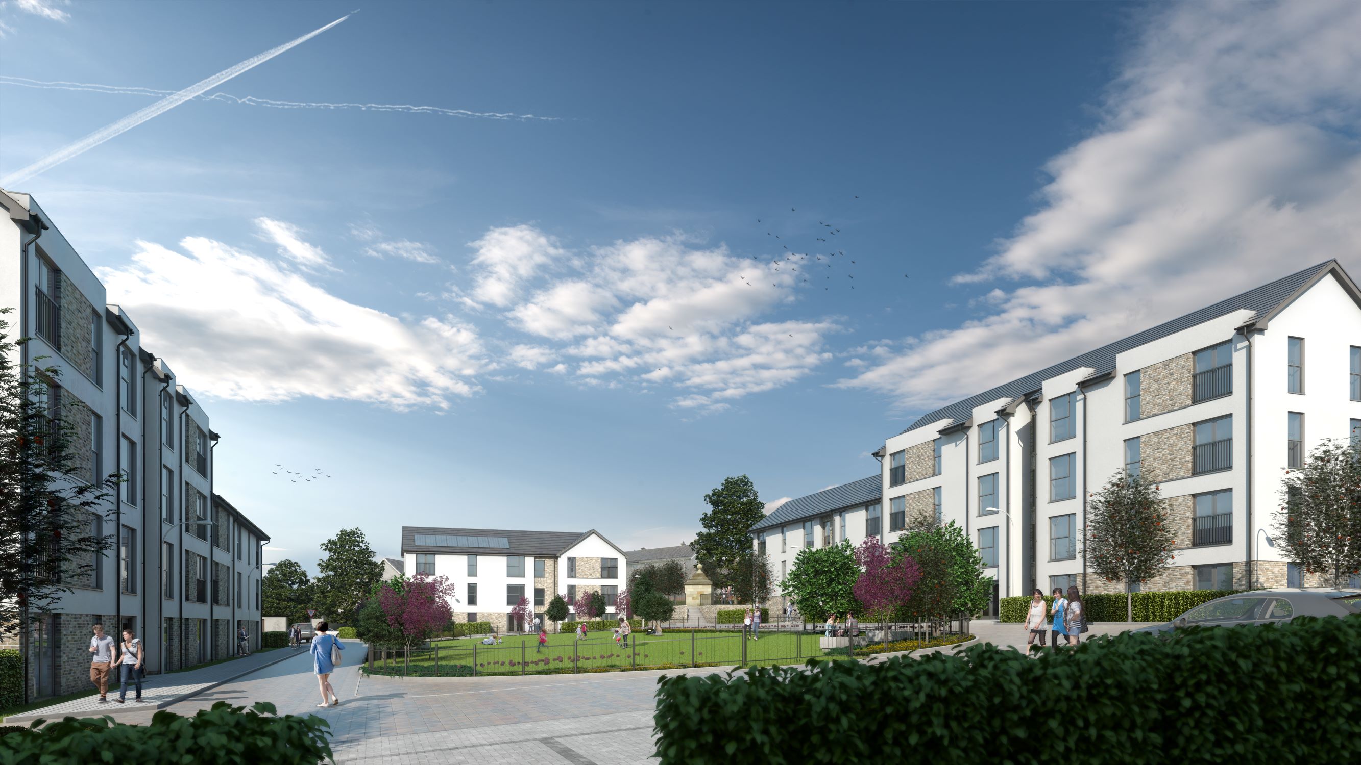 The development has been designed around a village green theme, and the spacious new homes consisting of a mix of 79 one, two and three-bedroom flats and six terraced houses, will be let for mid-market rent when they are completed.